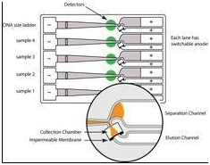 運(yùn)行中,軟件通過實(shí)時光路檢測,和參考泳道中的DNA ladder進(jìn)行比對,確定已經(jīng)設(shè)置回收長度范圍的DNA片段到達(dá)洗提泳道(elution channel)的準(zhǔn)確時間