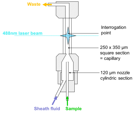 Partec擁有超過40年的流動室設計經驗與技術,其生產的高機械精密度石英流動室內徑250um×350um,不易堵塞,散射粒度范圍跨度涵蓋100nm至100μm。其核心技術是顆粒在高速流經流動室時,通過高壓鞘液的包裹,準確、穩定、連續地通過各個激光的光斑中心,被激發的熒光信號通過光膠耦合下的大孔徑物鏡被最大程度地接收。高精度石英流動室的專利技術可保證所有參數的精確度達到很高,即變異系數CV≤2%,樣本采用計算機控制推進器技術,其單一方向通過流動室,有效避免了交叉污染。