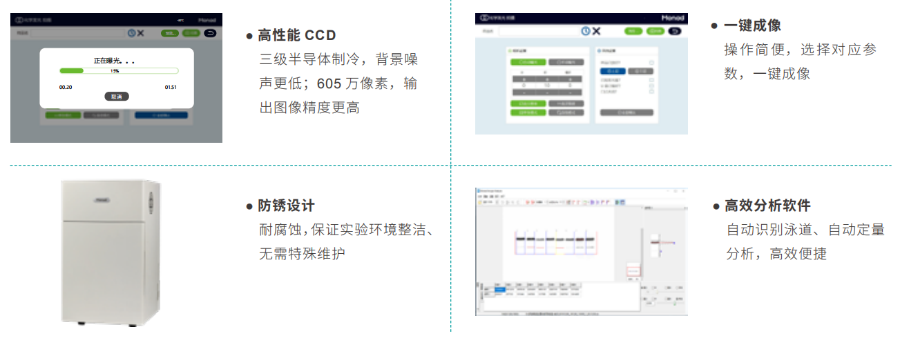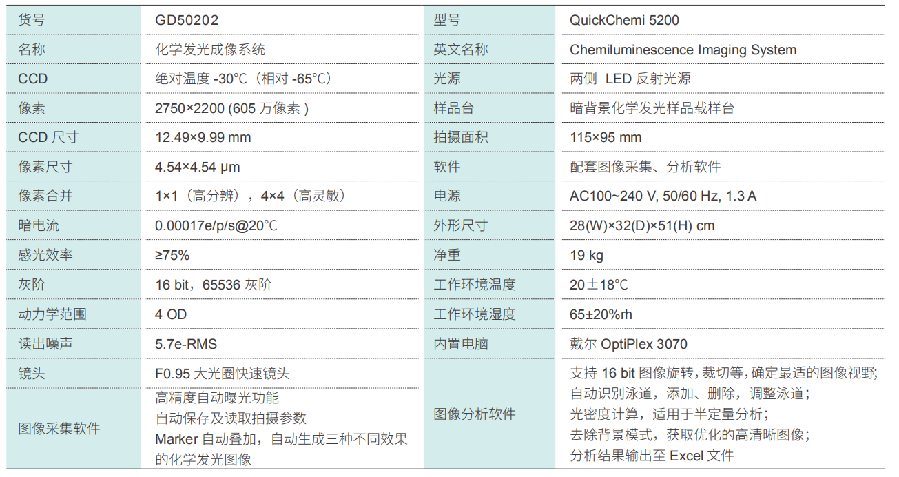 Quickchemi 5200化學發光成像系統適用于ECL發光直接成像,采用三級深度制冷CCD作為感光芯片,最大程度降低暗電流,提高信噪比。像素值高達605萬,并具有極高感光效率,結合F0.95大光圈鏡頭,收集微弱信號能力更強,成像效果更好,速度更快,且線性范圍更寬。特殊設計的防銹機身,簡單大方耐腐蝕;外接 24 寸大屏顯示器,強大的拍攝及分析軟件,操作簡單便捷,拍攝不同信號強度樣品時,能自動匹配拍攝參數,實現“一鍵成像”。