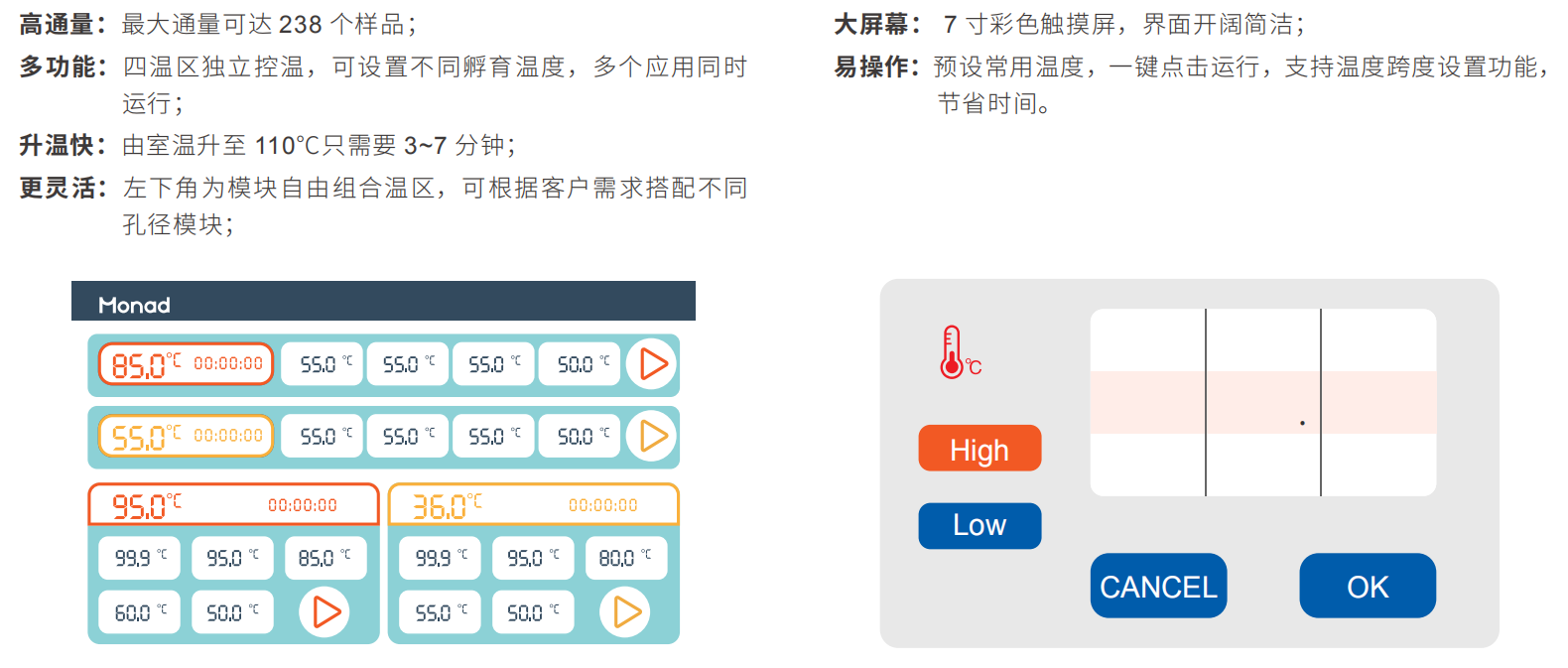 HFM 200是專用的中高溫孵育儀器,升溫速度快,溫度范圍30℃至110℃,四個溫區獨立控溫,可同時進行4 個不同溫度孵育的實驗,例如樣品的變性、酶失活及酶切等反應 均可應用此儀器。自由組合溫區面積為 8.1 cm(W) × 7.4 cm(L),可適配3個10孔0.5 ml模塊、24 孔 0.2 ml 模塊、10孔1.5 ml/2 ml 模塊或者3孔5 ml 模塊,以上模塊也可互相交叉混合搭配,以滿足客戶需求,除自由組合溫區外,另外三個溫區模塊及通量分別為 24 孔1.5 ml + 11 孔0.5 ml、24孔1.5ml + 11孔0.5 ml、96孔0.2 ml(可適配 0.2 ml 96孔板、8連管及單管),最高通量可達238個樣品。
