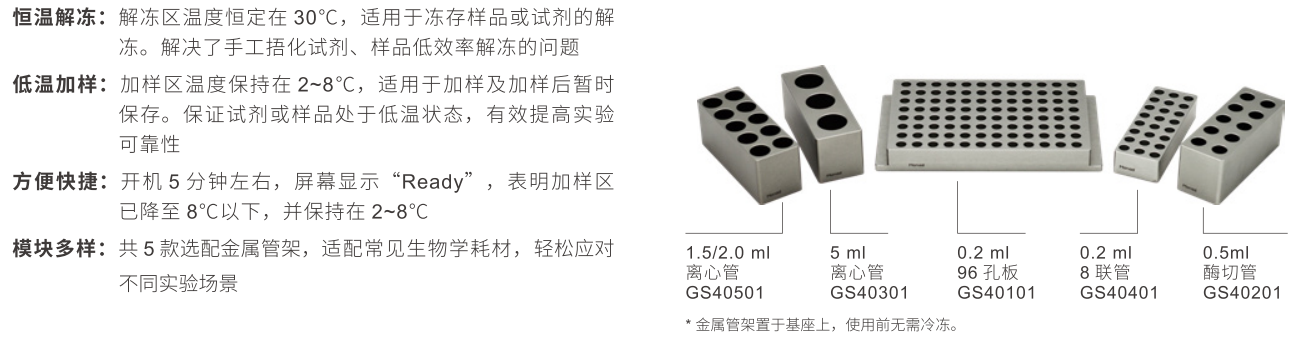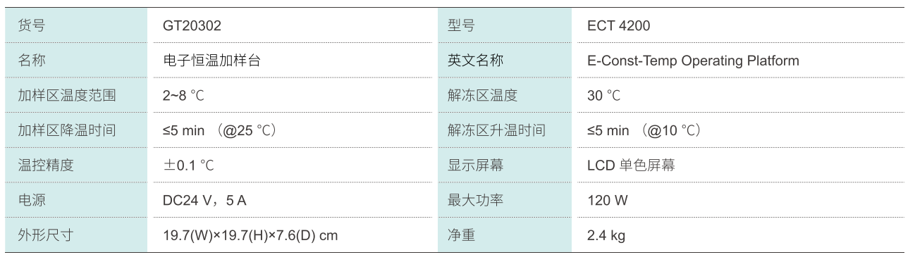 ECT4200電子恒溫加樣臺適用于生物學實驗中低溫加樣及試劑、樣本的解凍和臨時低溫儲存。儀器具有兩個預設溫度。不同的區域:解凍區溫度恒定在30℃,用于解凍試劑、樣本;加樣區溫度保持2~8℃,用于低溫實驗。搭配金屬管架,可適配常見生物學耗材。LCD液晶屏簡明顯示儀器當前狀態。一鍵開機,操作便捷。